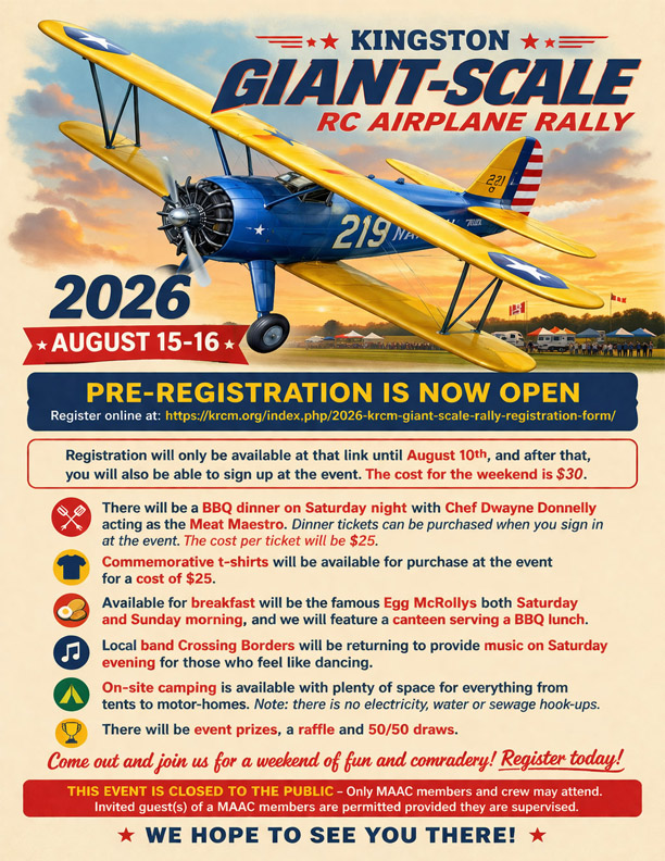 The Kingston Radio Control Modellers are proud to host the 38th Annual KRCM Giant Scale Rally at our flying field on August 15th and 16th. This long-standing event continues to be one of the premier giant scale aircraft gatherings in Canada—bringing together pilots, enthusiasts, and spectators for an unforgettable weekend of flying and camaraderie.